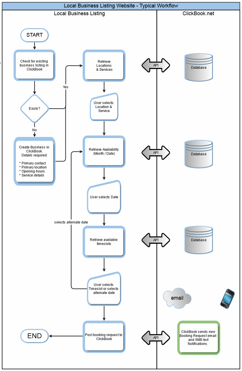 typical flowchart), providing them with the prospect of real-time availability display and confirmed appointment booking, detail management and appointment reminder services for their customers.